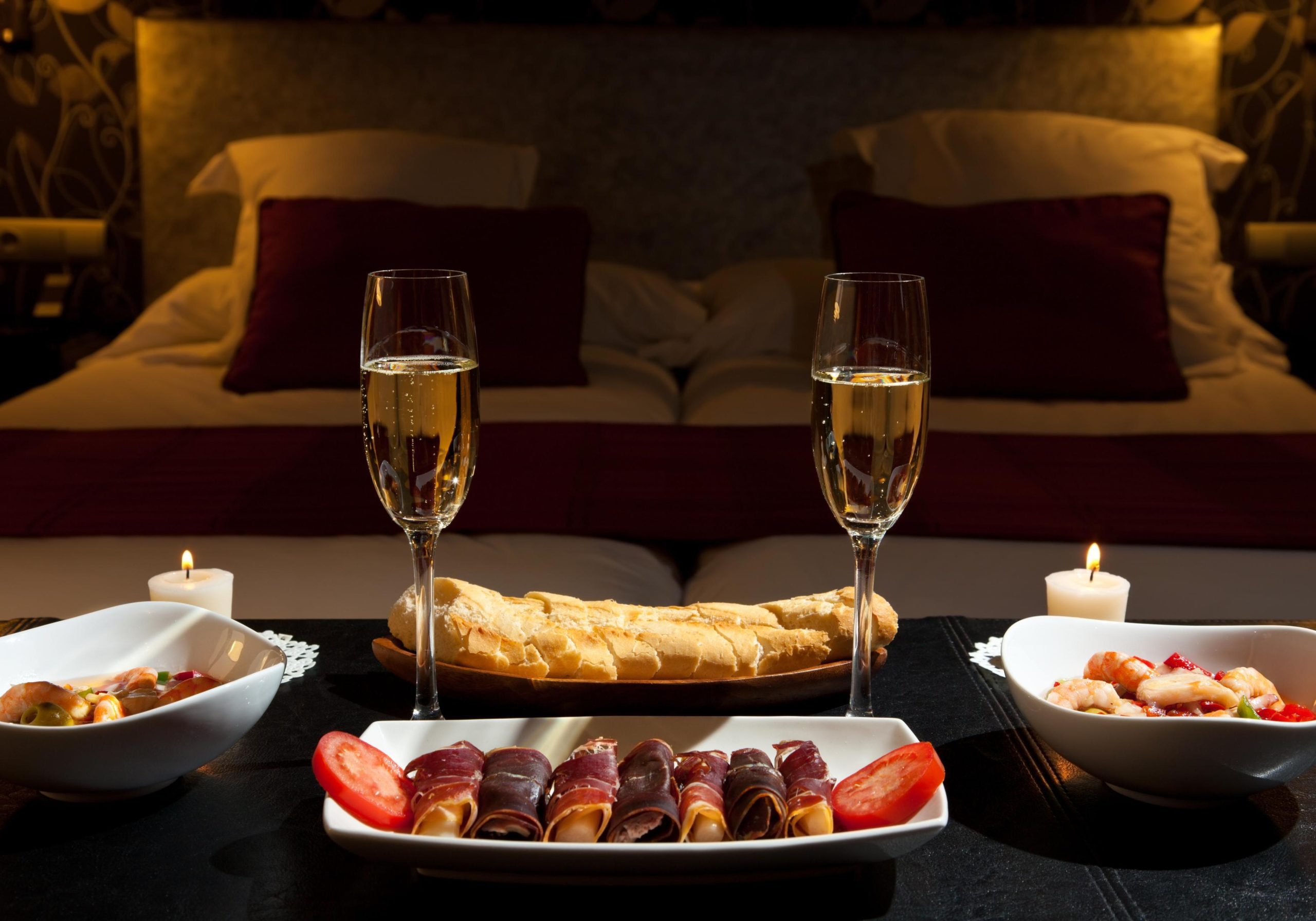 - Закуски: Канапе с красной рыбой и авокадо, рулетики из баклажанов с ореховой начинкой, сырная тарелка.